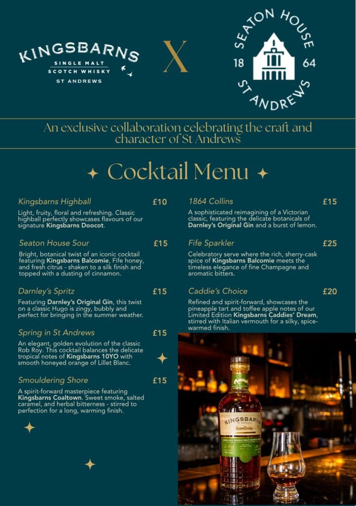 Guests are invited to enjoy an evening of crafted cocktails and Scottish hospitality at Seaton House in St Andrews on Thursday, 23 April. Teaming up with Kingsbarns Distillery, the hotel will host an exclusive event from 5pm, where distillery experts will showcase a selection of signature serves created specially for the occasion.
