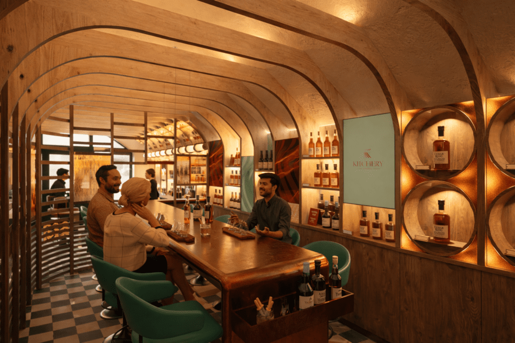 Materiality will play a central role in shaping the interior atmosphere. Warm leathers, natural timbers, aged copper, and backlit rippled glass combine to create a rich, layered aesthetic rooted in the spirit of the distillery while delivering a fresh, contemporary feel.